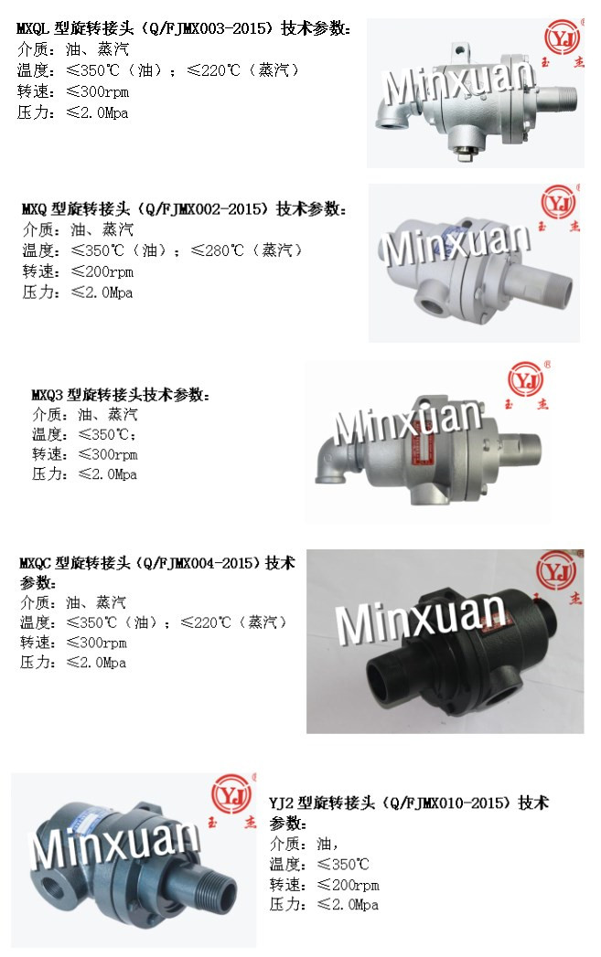 球面密封 球面密封的旋转接头有MXQL型、MXQ型、MXQ3型、MXQC型及YJ2型。其特点是:旋转轴采用40CR棒料一体式精车加工,并经过特殊处理,提高强度、硬度、耐磨性及其机械综合性能;球面密封设计抗摆动,可自动调心,对设备的同心度要求比较低;双无油轴承支撑,更稳定,无需加注润滑油脂;可更换式密封盖,便于维修。