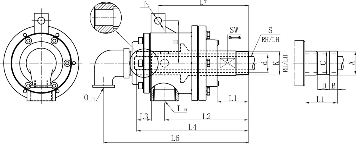 | Model | K | I | O | S1 | d | L1 | L2 | L3 | L4 | L6 | L7 | N | H | SW | 法兰式外管尺寸对照表 | |||