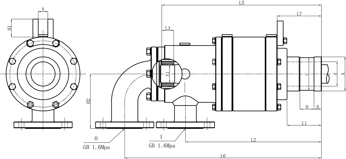 | Model | I | O | S1 | d | L1 | L2 | L3 | L5 | L6 | L7 | N | H1 | H2 | 法兰式外管尺寸对照表 | |||