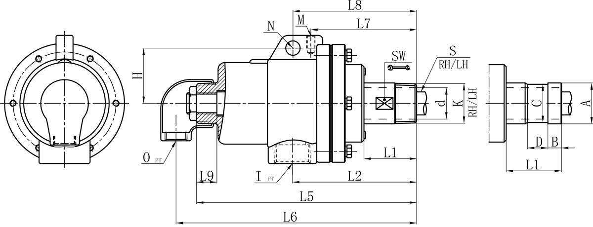 Model K I O S d L1 L2 L5 L6 L7 L8 L9 M N H SW 法兰式外管尺寸对照表