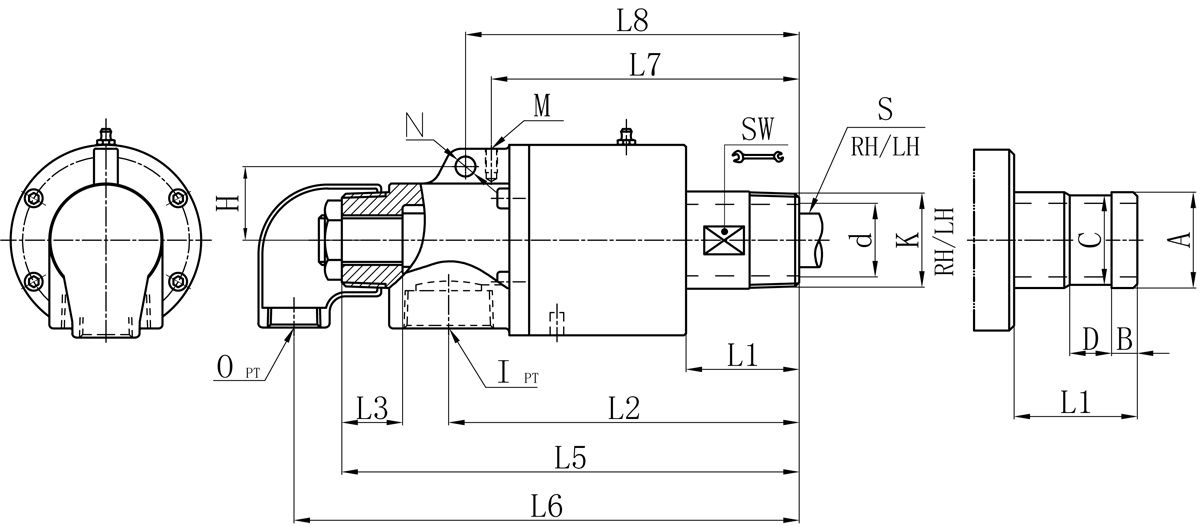 | Model | K | I | O | S | d | L1 | L2 | L3 | L5 | L6 | L7 | L8 | M | N | H | SW | 法兰式外管尺寸对照表 | |||