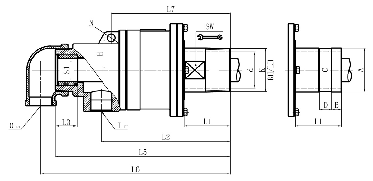 Model K M I O S S1 D1 L1 L2 L3 L5 L6 L7 L8 N SW H 法兰式外管尺寸对照表